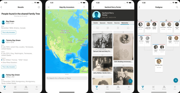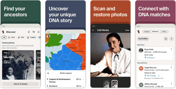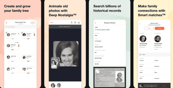 Den sammenligner treet ditt med tusenvis av andre og kan legge til hele grener eller bilder med ett enkelt klikk. Du kan bla gjennom historiske arkiver eller samarbeide med andre brukere. Appen inneholder også bildebehandlingsverktøy som Deep Nostalgia og LiveMemory, som lar deg animere gamle bilder ved hjelp av kunstig intelligens.